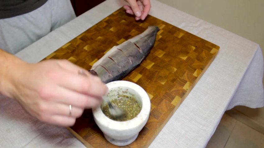 Натерти рибу сумішшю спецій зверху та в середині. Простежити, щоб маринад потрапив у надрізи.![]()