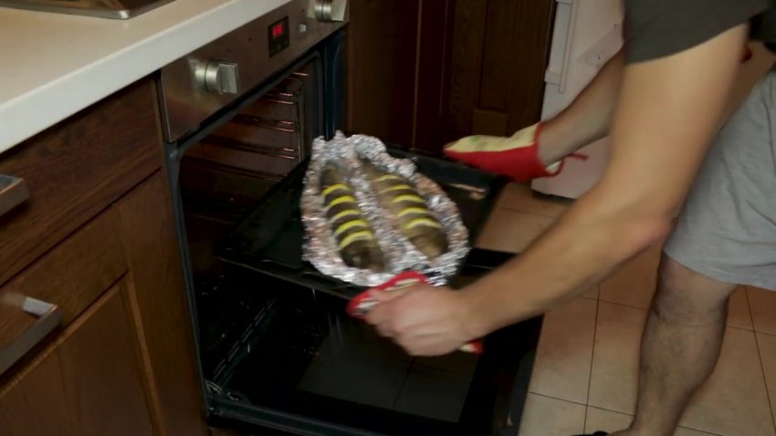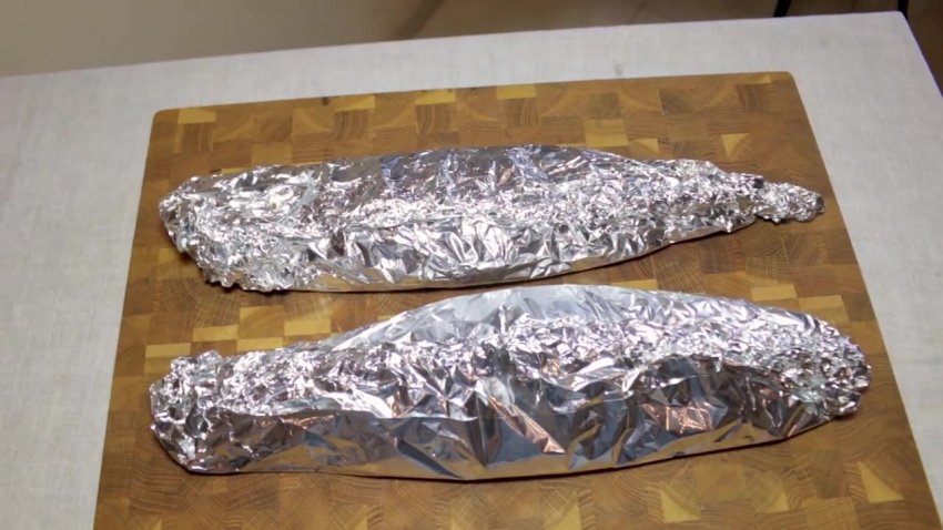 Покласти рибу надрізами догори і загорнути її у фольгу. Дати тушці промаринуватися близько 0,5 години.![]()