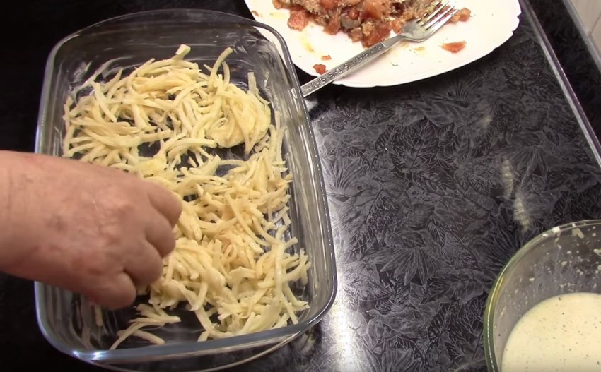 Очищені бульби картоплі натерти на тертці з великими отворами. Необхідно отриману масу віджати, а зайву рідину вилити, вона не знадобиться. Духовку ввімкнути на +200°С. Жароміцну форму необхідно змастити вершковим маслом. Потім слід викласти на дно половину порції картоплі.![]()