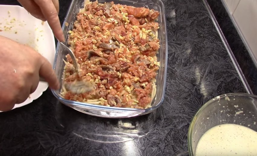Щоб приготувати соус, вбийте в миску яйце, посоліть, поперчіть, додайте мускатний горіх, вершки. Не забудьте збити вінчиком. Потім необхідно всипати туди ж тертий твердий сир, перемішати.![]()