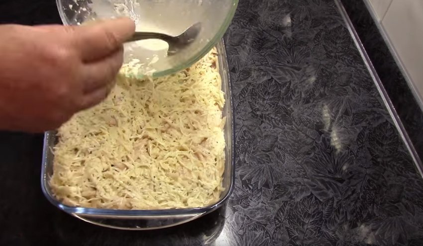 Далі поверх цих інгредієнтів необхідно рівним шаром розкласти рибу. Далі - решту натертої картоплі.![]()