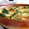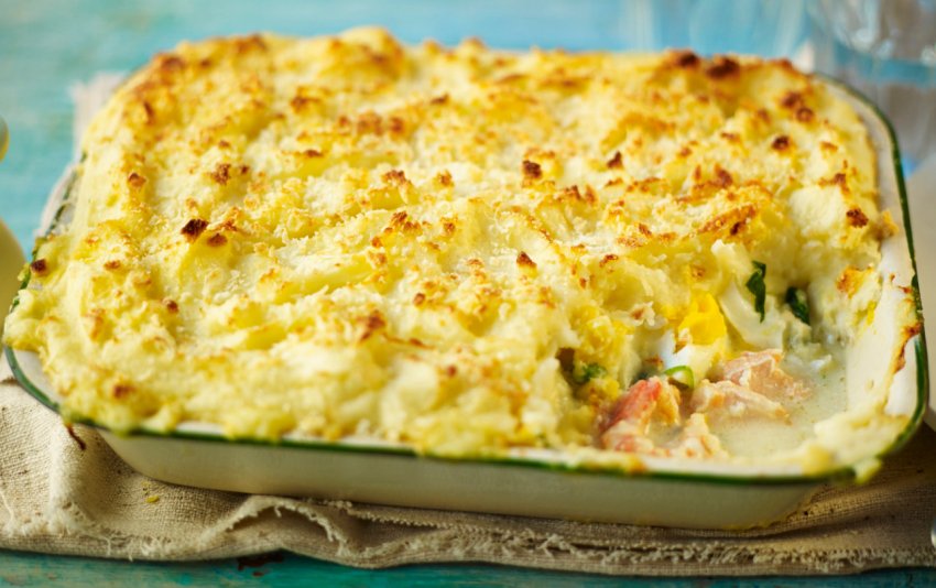 - Шарами викласти пюре з картоплі, рибу з овочами. Залити молоком, що залишилося.