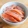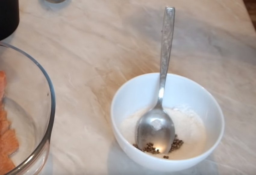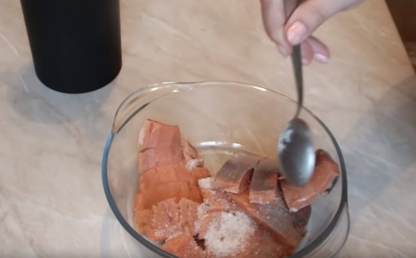 - Змішати 2 чайні ложки цукру з 60 г солі. Обваляти скибочки горбуші в спеціях. Залишити засолювати на 3 години. Додатково можна помістити вантаж на майбутню страву.