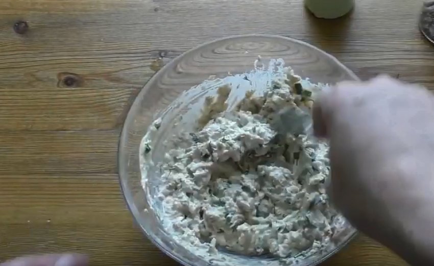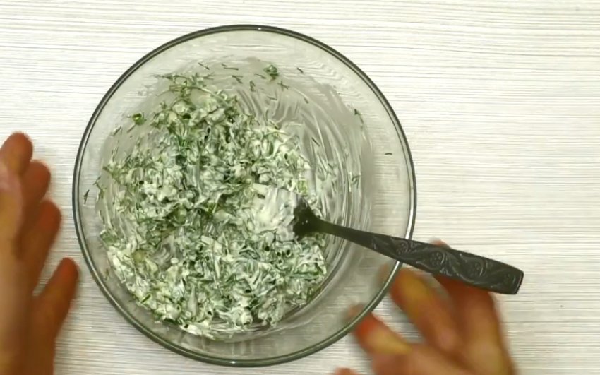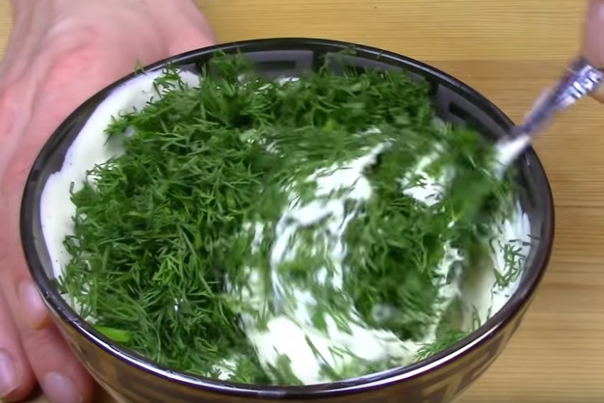 - В окремій ємності змішайте майонез і подрібнений кріп.