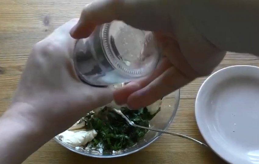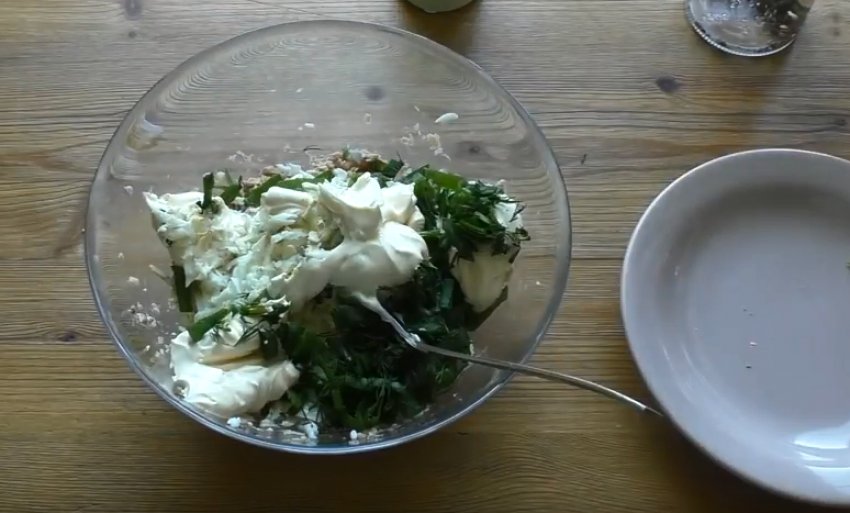 Подрібніть зелень і змішайте її з майонезом у глибокій ємності.![]()