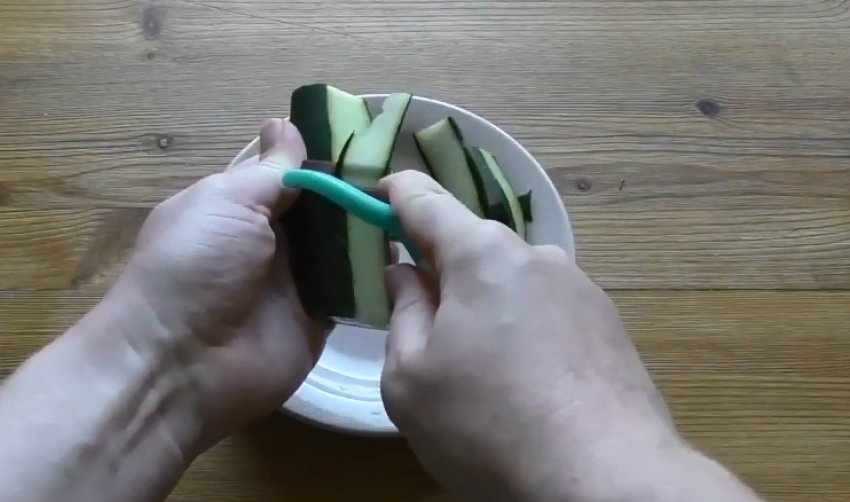 Огірок подрібніть тонкими смужками, використовуючи ніж для чищення картоплі.![]()