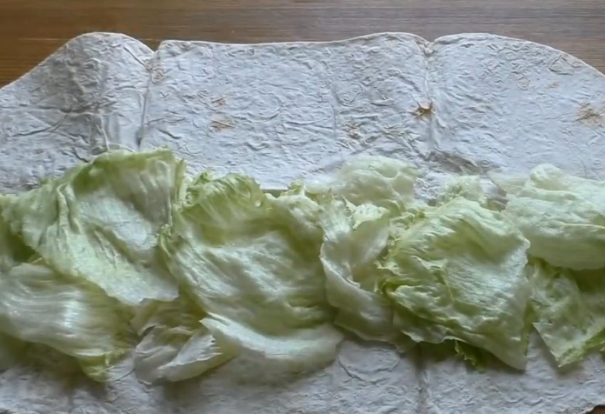 - Розкладіть лаваш на столі, а поверх викладіть промите листя салату.