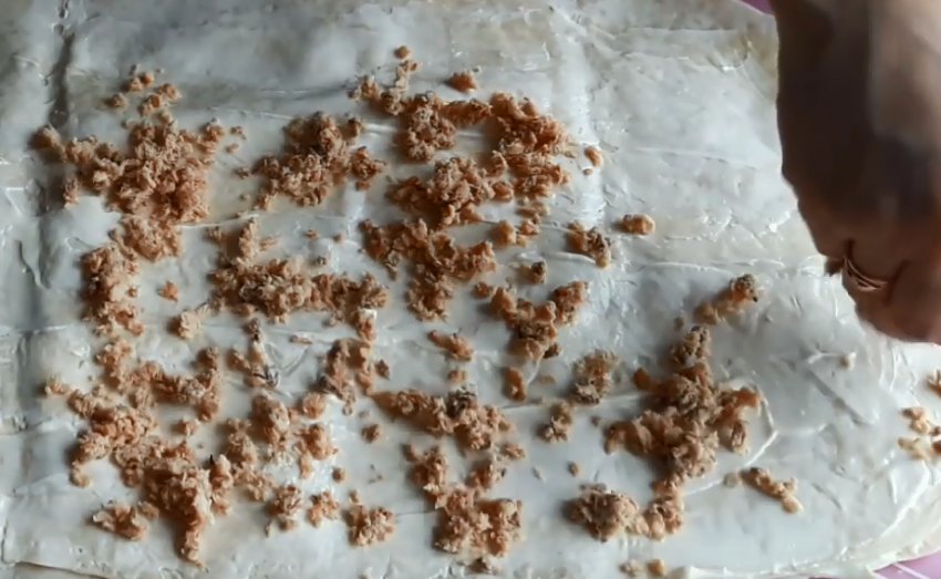- Один тонкий лаваш розкладіть на рівній поверхні та розподіліть по ньому рибу, а другий покладіть поверх і ретельно притисніть.