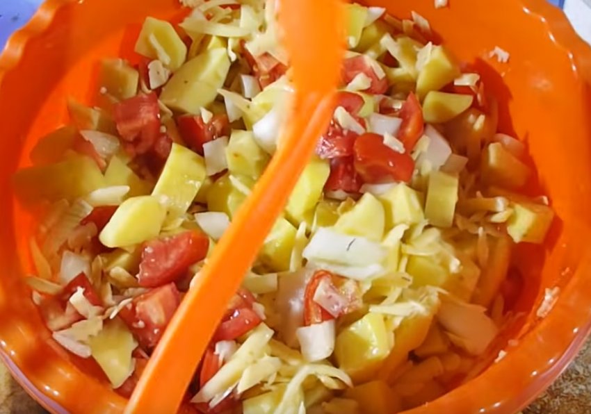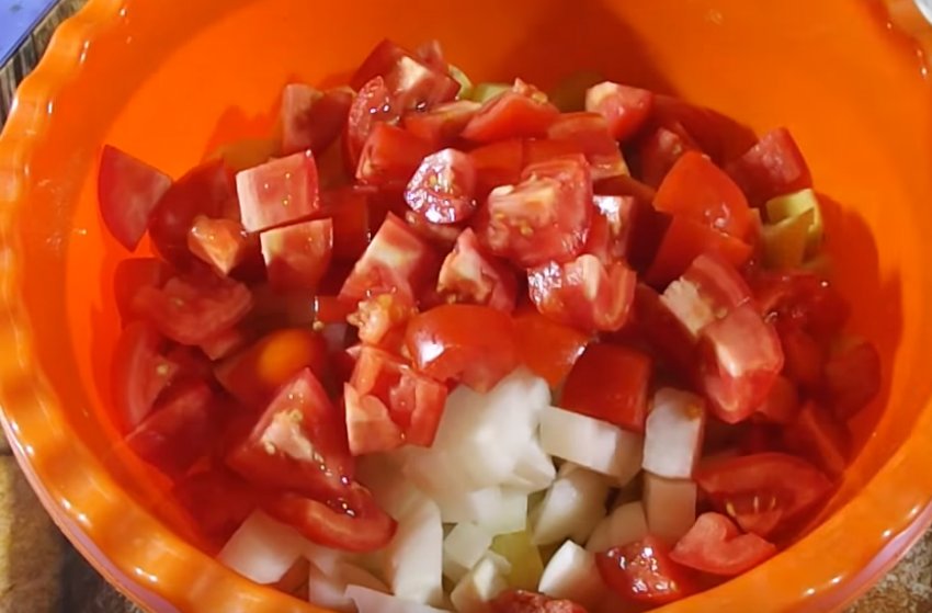 Томати порізати невеликими шматочками, з'єднати з цибулево-картопляною масою.![]()