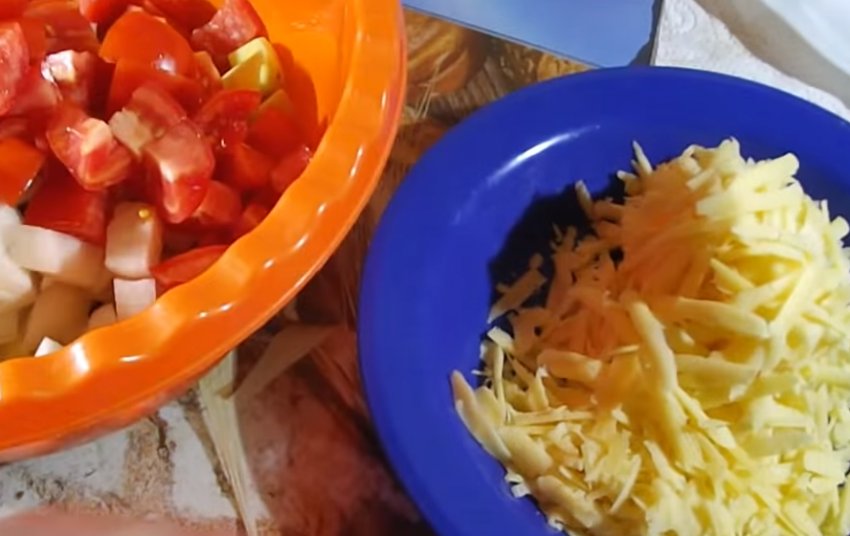 Сир натерти на крупній тертці, додати до нарізаних інгредієнтів, ретельно перемішати.![]()