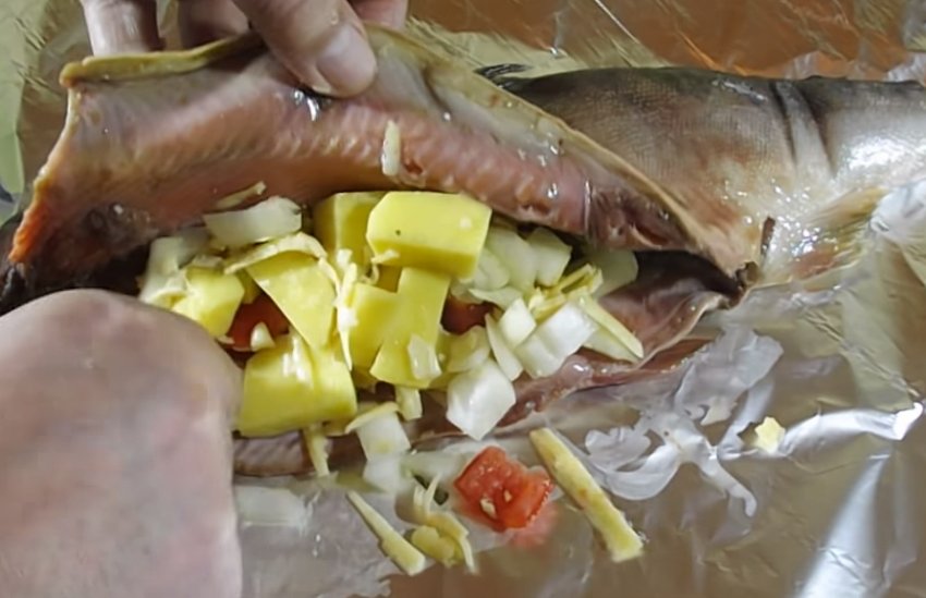 Горбушу нафарширувати овочевою масою, викласти на фольгу. Поверх тушки розташувати гірку з овочів.![]()