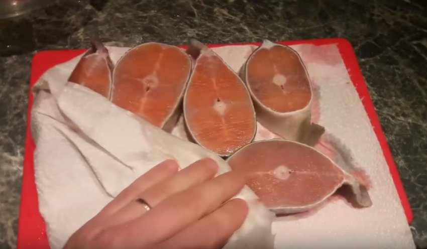 Злити воду і викласти стейки на паперовий рушник, щоб позбутися вологи.![]()