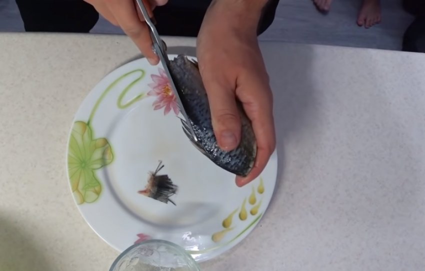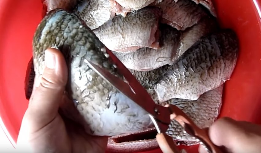 - У почищеної, випатраної та вимитої риби видалити плавники, голови, хвости.