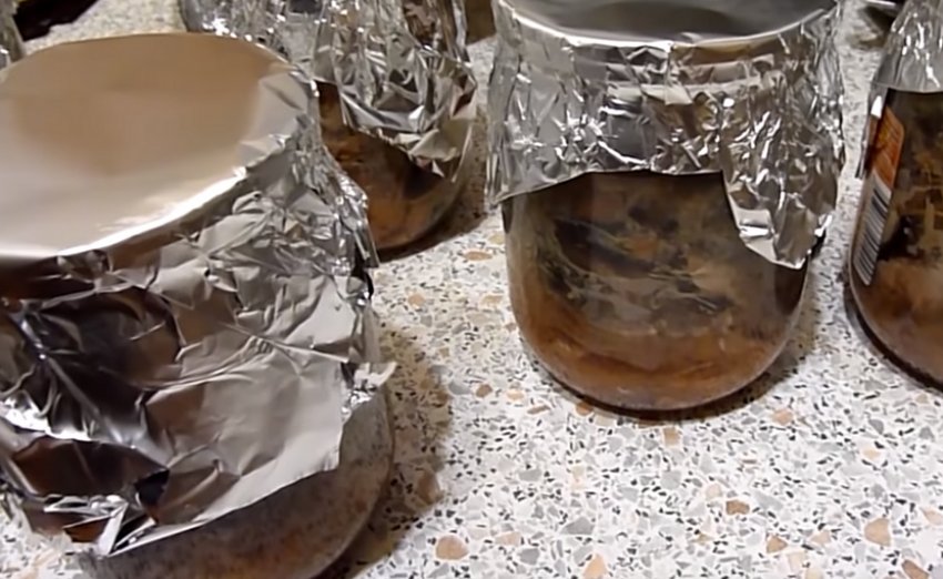 Залити в тару по 2-3 ст. л. олії. Накрити ємності кришками з фольги.