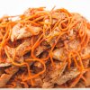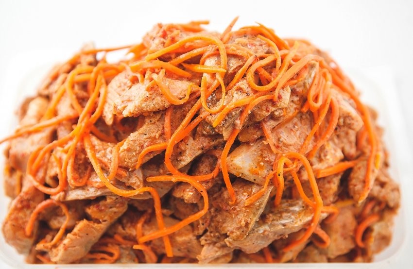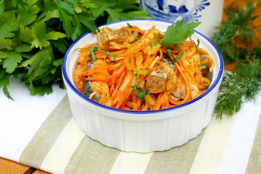 - Додати до риби цибулю, моркву, сіль, приправи. Добре підійде пряна суміш для овочів по-корейськи. Можна додати мікст із перцю, часнику та коріандру.