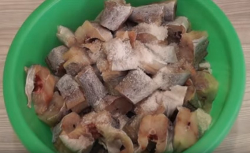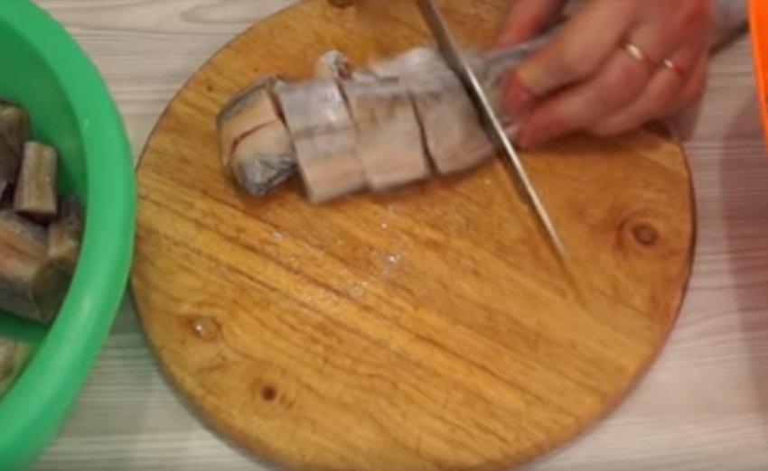- Видалити голови, хвости та плавники. Нарізати тушки порційними шматками завширшки по 2 см. Після очищення залишиться приблизно 1,5 кг.