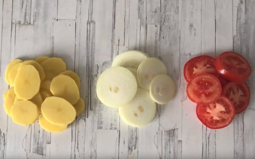 З картоплі зрізати шкірку і разом із цибулею та томатами нарізати бульби кільцями.![]()