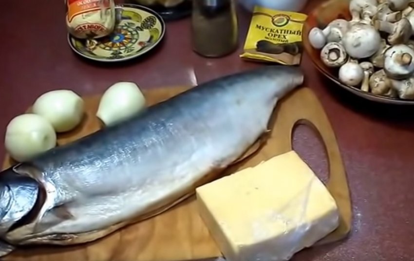 риби акуратно надсікти хребет біля голови і хвоста, видалити його. Порізати гриби і цибулю середніми шматочками.![]()
