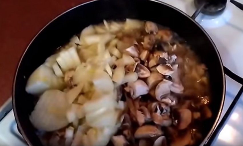 розігріту сковорідку покласти олію, відправити туди шампіньйони і цибулю, трохи посолити і обсмажувати суміш до золотистого кольору.![]()