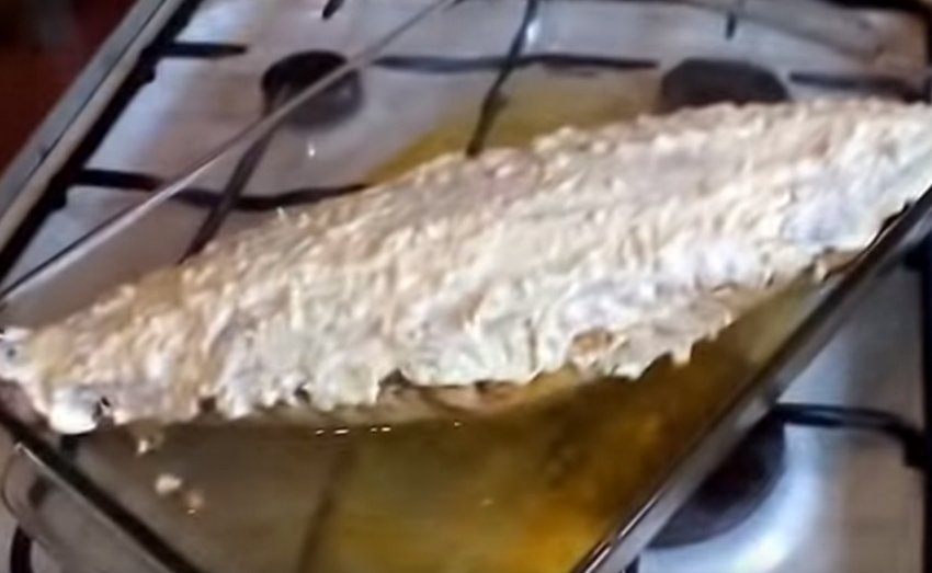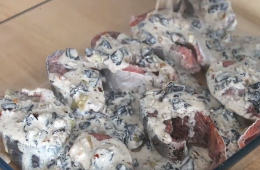 поставити на розігрів до 180°C. У цей час потрібно приготувати соус для змащення горбуші із суміші сметани та майонезу.![]()