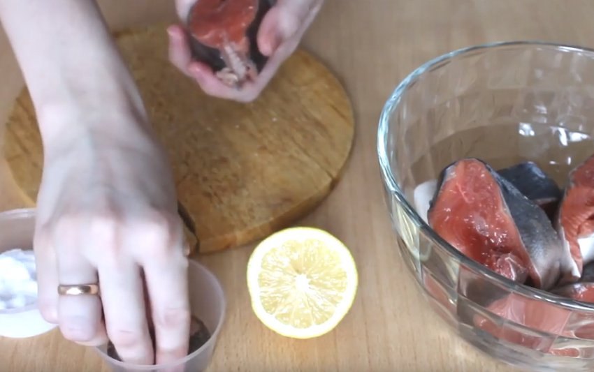 розділити на стейки, замаринувати в спеціях і солі та побризкати лимонним соком, відставити на 20 хвилин.![]()