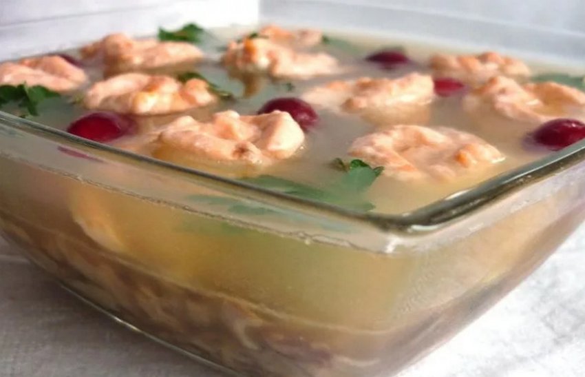 Желатин поставити на 30 сек. у мікрохвильову піч і розчинити у воді, якою він був залитий. Потім з'єднати з остиглим бульйоном і добре перемішати. Залити бульйоном підготовлену страву і поставити в холодильник до застигання.![]()
