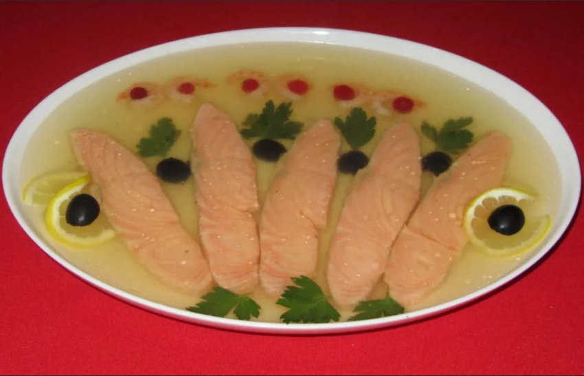 Готове холодець можна прикрасити або посипати зеленню. Таку страву добре подавати з хріном або гірчицею, а також шматочком хліба. Бульйони з червоної риби чудово желюються самі, без додавання желатину. Страва виходить смачною і зовсім нежирною, на відміну від звичайного холодцю з м'яса.