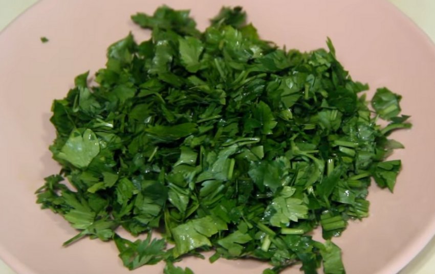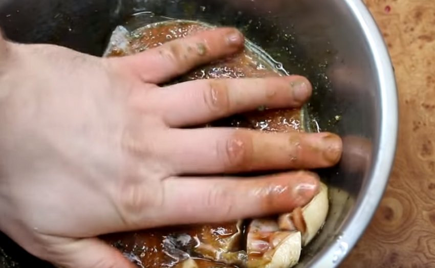 петрушки, оливкової олії, соєвого соусу, перцю та солі змішати маринад і викласти в нього стейки. Притиснути їх, щоб вони добре просочилися з усіх боків.![]()