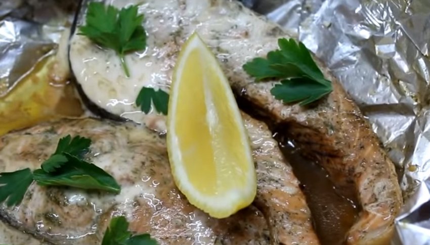 духовку до 180°С і запікати стейки на 25 хвилин. Подавати рибу гарячою, прикрасивши зеленню та шматочком лимона.![]()