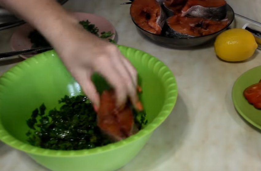 , випатрати і почистити рибу від луски. Відрізати голову. Тушку обробити на стейки.![]()