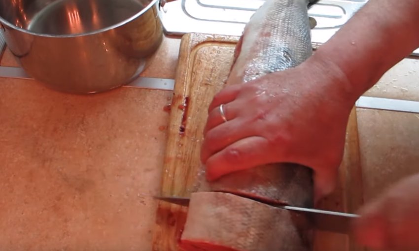Відрізати голову. З неї можна буде потім зварити юшку. За допомогою ножиць обрізати черевце до місця, в якому закінчуються ребра рибини. Решту тушки нарізати шматками завширшки по 3-5 см.![]()