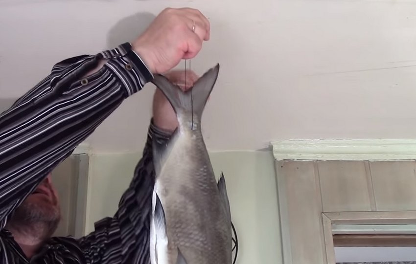 тушку сушитися хвостом догори. Таким чином, уся зайва сіль опускається до голови і буде викинута перед вживанням. Гачок вводять трохи нижче хвостового плавця.![]()