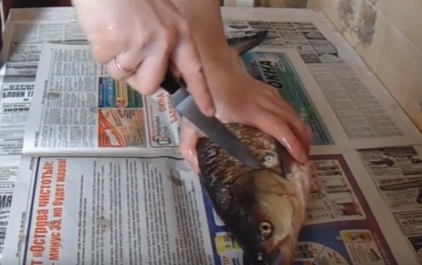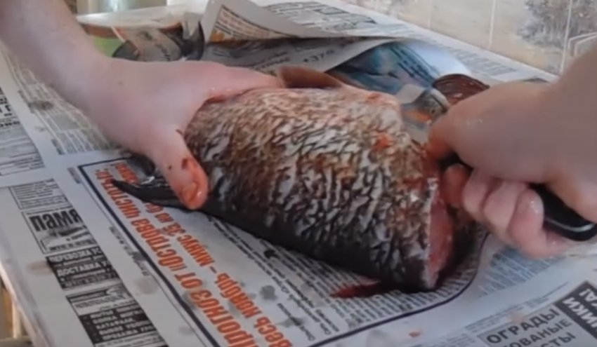 - Рибу потрібно обробити, відокремивши голову і хвостовий плавник, потім розпороти живіт і витягти нутрощі.
