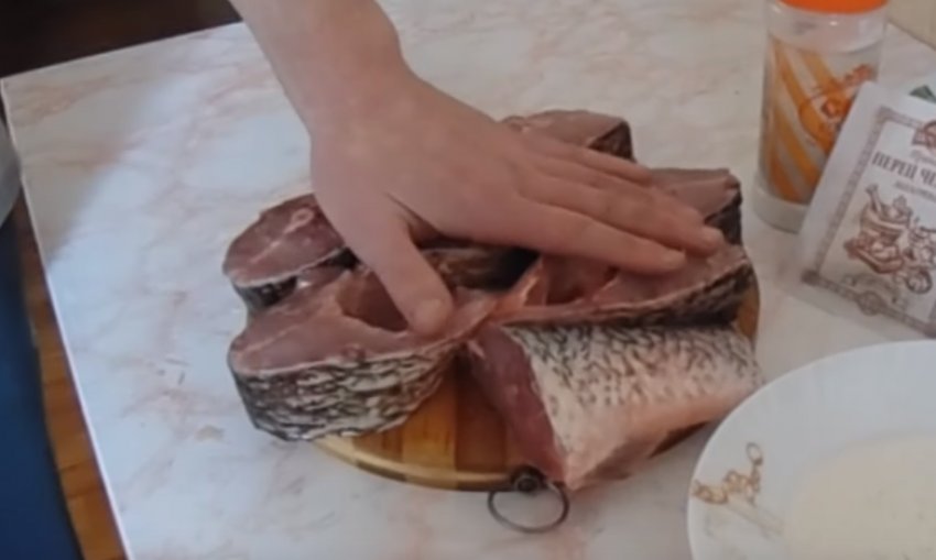 Порізати жереха на стейки, з великого екземпляра виходить 6 середніх шматків.![]()