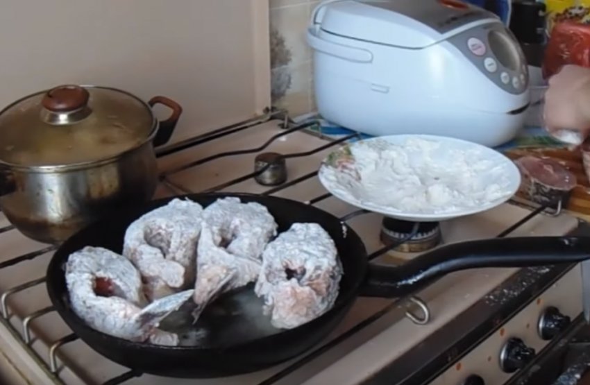 - Налийте на сковороду олію, що залишилася, і викладіть обвалені в борошні шматки риби. Готуйте 7-10 хвилин із кожного боку.