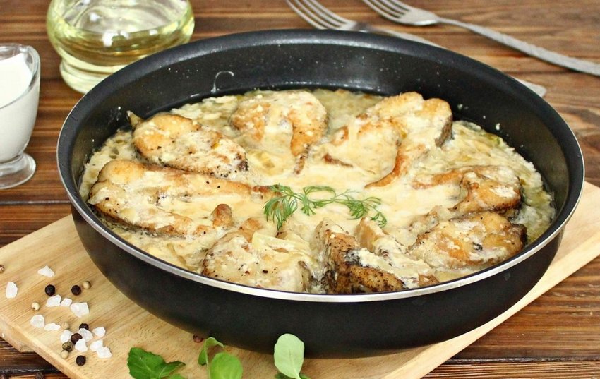 - Страву подавайте гарячою разом зі сметанним соусом і свіжою зеленню.