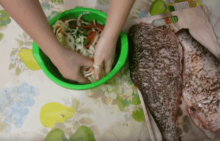 Поверх неї помістити рибу. Ще одну частину овочів розподілити всередині обох рибин. Соковитою третиною, що залишилася, накрити тушки зверху.![]()
