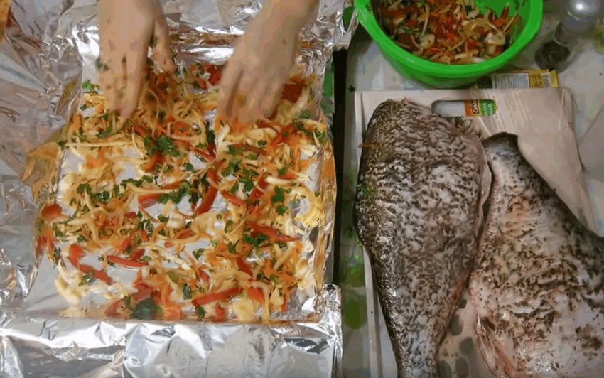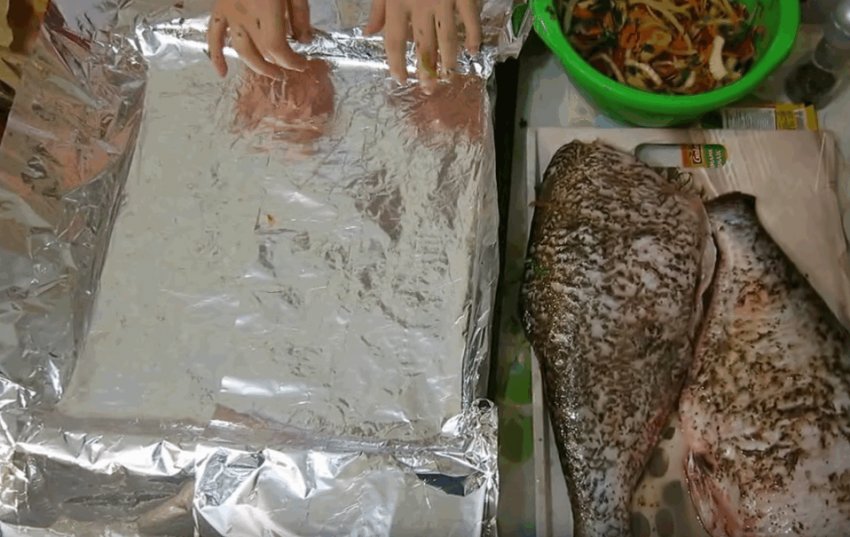 На деко застелити фольгу, врахуйте, що в кінці підготовки вона повинна повністю накрити рибу.![]()
