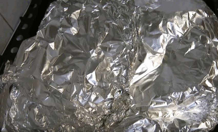 Загорнути фольгою щільно всю страву. Запікати в розігрітій до 200 градусів духовці 45 хвилин.![]()