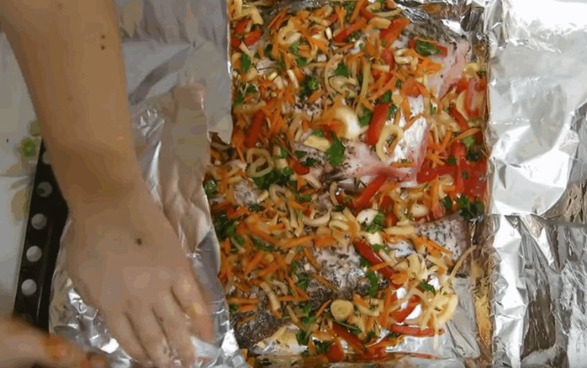 - Рибу покласти на овочеву підкладку, помістити всередину трави, часник, цибулю і лимон.