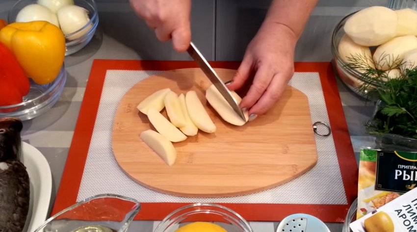картоплю вздовж, на 4-6 частин, а потім в окремій ємності посоліть, поперчіть і змастіть частиною рослинної олії.![]()
