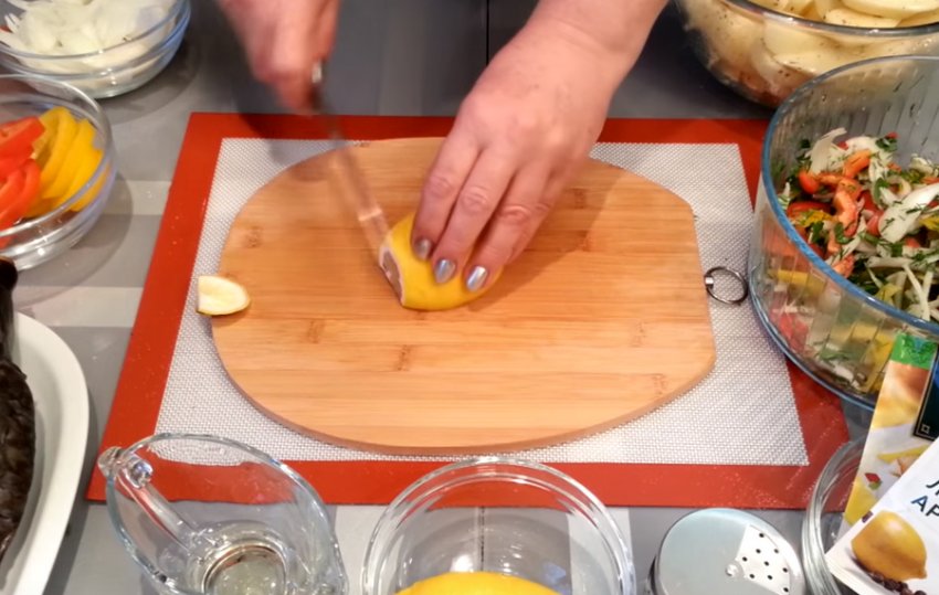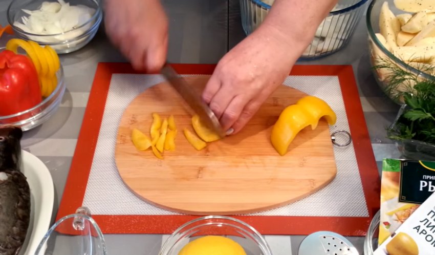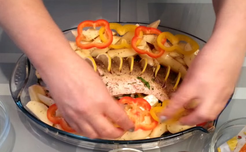 в розрізи на рибі півкільця лимона, а потім зверху прикрасьте страву кільцями перцю.![]()