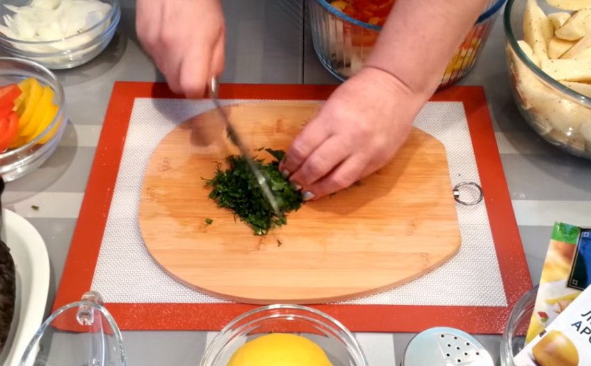 - Покладіть кожен шматок тушки на фольгу, залийте його половиною столової ложки маринаду, а зверху засипте дрібно нарізаною зеленню.
