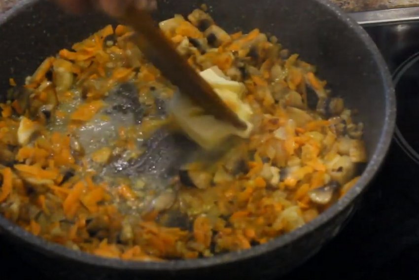 обсмажте цибулю, додайте до неї гриби і підрум'яньте суміш до золотистої скоринки. Відправте на сковороду моркву, смажте її до напівготовності, а потім помістіть до неї протертий через прес часник.![]()