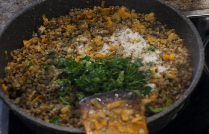 овочі 2-3 хвилини, з'єднайте їх із вершковим маслом. Після того, як воно розтане, додайте до овочів гречку.![]()