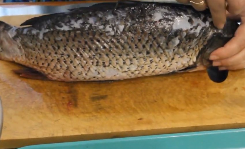 - Обробленого сазана слід добре прополоскати під проточною водою, після чого обрізати на тушці плавники, а в разі потреби і голову.