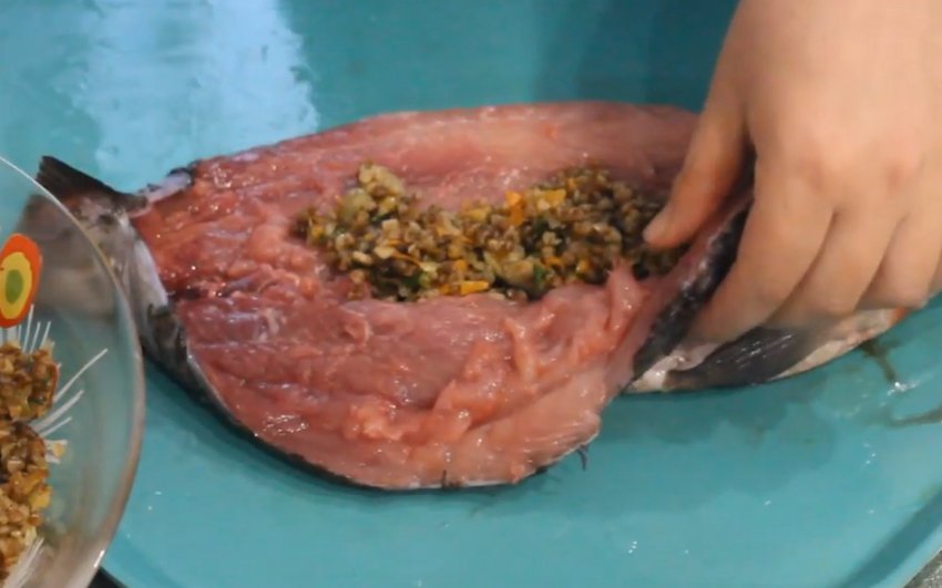 рибу гречано-овочевим фаршем, а після цього зшийте краї тушки кулінарною ниткою. Потім зовні сазана добре посоліть.![]()