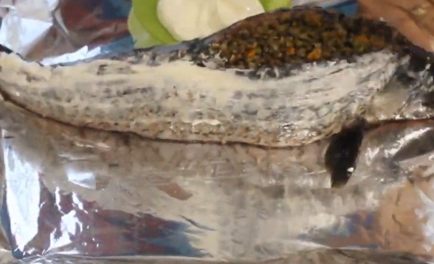 - Загорніть рибу у фольгу і поставте в розігріту до +200°С духовку (готувати сазана потрібно близько 30 хвилин).