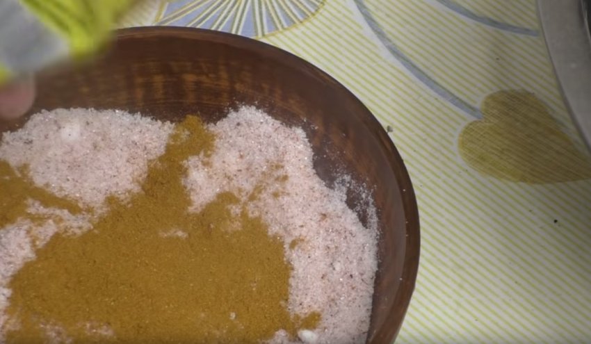 Змішати в мисці сухі інгредієнти. Покласти сазана в миску і обсипати посолочною сумішшю, частково втираючи в тушу.![]()