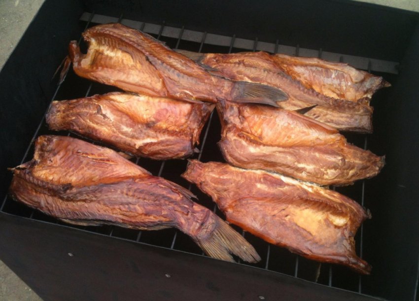 Закрити кришку і залишити коптитися на 25 хвилин. Потрібно враховувати, що тривалість процесу залежить від величини шматків і може займати від 1 до 20 годин. Термін зберігання копченої таким способом риби невеликий - до 1 тижня.![]()